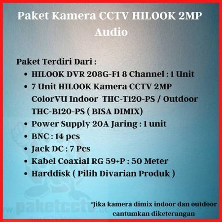 Paket Terdiri Dari :HILOOK DVR 208G-F1 8 Channel : 1 Unit7 Unit HILOOK Kamera CCTV 2MP ColorVU Indoor THC-T120-PS / Outdoor THC-B120-PS ( BISA ...